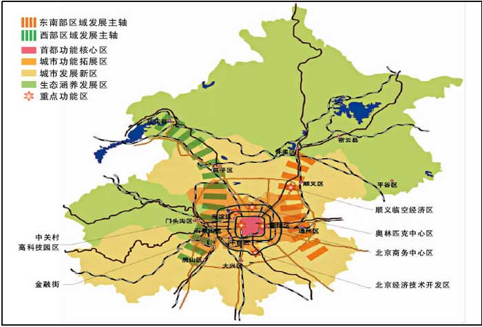 北京市發(fā)改委今天(本網(wǎng)編注:12月6日)上午發(fā)布了《北京市“十一五”時(shí)期功能區(qū)域發(fā)展規(guī)劃》。這是北京市在中長(zhǎng)期規(guī)劃中第一次打破行政區(qū)劃編制的區(qū)域經(jīng)濟(jì)規(guī)劃。 規(guī)劃中設(shè)定的發(fā)展思路為:建設(shè)北京東部、西部發(fā)展帶;通過“優(yōu)化城區(qū)、強(qiáng)化郊區(qū)”,形成特色突出、分工明確、發(fā)展均衡的四大城市功能區(qū)域,即首都功能核心區(qū)、城市功能拓展區(qū)、城市發(fā)展新區(qū)和生態(tài)涵養(yǎng)發(fā)展區(qū);推動(dòng)六大重點(diǎn)產(chǎn)業(yè)功能區(qū)發(fā)展。