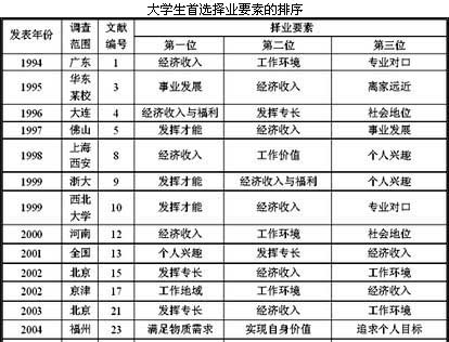 為了能夠比較準(zhǔn)確回答上述問題,揭示當(dāng)代大學(xué)生的擇業(yè)觀,我們采用文獻(xiàn)分析的方法,在中國(guó)期刊全文數(shù)據(jù)庫(kù)中以大學(xué)生擇業(yè)觀調(diào)查為主題搜尋1980年至今公開發(fā)表的有關(guān)大學(xué)生擇業(yè)觀的調(diào)查報(bào)告,查得69篇文獻(xiàn)。通過(guò)進(jìn)一步調(diào)查篩選,查找具有同質(zhì)性、可比較性的文獻(xiàn),最終確定24篇作為研究樣本。在文獻(xiàn)搜尋中發(fā)現(xiàn),上世紀(jì)80年代初到90年代初的這方面調(diào)查報(bào)告很少。1994年之后這方面的調(diào)查多了起來(lái),所以選取的報(bào)告主要從1994年開始。這24篇文獻(xiàn)調(diào)查的地域廣泛,涉及京、滬、粵、浙、豫、皖等地;學(xué)科齊全,設(shè)計(jì)文、理、農(nóng)、醫(yī)、工等學(xué)科;樣本數(shù)量大,發(fā)放問卷的數(shù)量近5萬(wàn),回收率平均在85%以上,調(diào)查結(jié)果具有比較好的可信度和代表性。 這些調(diào)查報(bào)告向我們揭示了大學(xué)生擇業(yè)的基本傾向,以下是對(duì)各報(bào)告主要調(diào)查結(jié)果的匯總: 從以上表格中我們可以看出,上世紀(jì)90年代以來(lái)大學(xué)生的擇業(yè)觀念相對(duì)穩(wěn)定,比較一致,大學(xué)生所在地域、學(xué)校、所學(xué)專業(yè)及性別等對(duì)大學(xué)生擇業(yè)觀的影響并不顯著。大學(xué)生們選擇職業(yè)時(shí)優(yōu)先考慮的因素主要有兩大類,物質(zhì)因素首當(dāng)其沖,如經(jīng)濟(jì)收入、物質(zhì)待遇、工資福利、報(bào)酬、工作環(huán)境,甚至離家的遠(yuǎn)近等;第二類因素為個(gè)人職業(yè)發(fā)展因素,如個(gè)人興趣、專長(zhǎng)的發(fā)揮、自我價(jià)值的實(shí)現(xiàn)、工作發(fā)展前景、單位前景、晉升機(jī)會(huì)、發(fā)展機(jī)會(huì)、社會(huì)地位等。