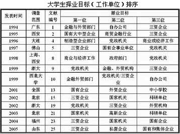 擇業(yè)觀是職業(yè)價(jià)值觀的重要組成部分,對(duì)大學(xué)生的擇業(yè)行為有著重要的影響。從1985年中央頒布的《關(guān)于教育體制改革的決定》為標(biāo)志,我國(guó)大學(xué)生的就業(yè)制度從計(jì)劃經(jīng)濟(jì)的統(tǒng)包統(tǒng)配開始轉(zhuǎn)向市場(chǎng)經(jīng)濟(jì)的自主擇業(yè)、雙向選擇,至今已走過(guò)了20年的歷程。在大學(xué)生就業(yè)壓力有增無(wú)減的今天,很多人認(rèn)為大學(xué)生的擇業(yè)觀也是造成其就業(yè)難的原因之一。那么,大學(xué)生的擇業(yè)觀具有什么樣的特點(diǎn)?在長(zhǎng)達(dá)20年的歷史發(fā)展階段,不同年代大學(xué)生的擇業(yè)觀有沒有明顯的變化?如果說(shuō)大學(xué)生的擇業(yè)觀有偏差的話,又該怎樣調(diào)整這種偏差?