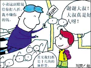 。玻霸溺R架,200元賣給你是講人情,300元賣給你是講交情,400元賣給你是行情。——眼鏡業(yè)暴利順口溜。 一副眼鏡加價(jià)到底有多大?周樂正告訴記者,在目前的眼鏡經(jīng)營模式中,從眼鏡出廠到消費(fèi)者終端,一副出廠價(jià)為22元的眼鏡通過傳統(tǒng)的經(jīng)銷渠道后,到消費(fèi)者手里價(jià)格最高可達(dá)430元。 現(xiàn)任北京好宜買超視眼鏡連鎖有限公司總經(jīng)理的周樂正近日接受本報(bào)記者采訪,自曝眼鏡業(yè)潛規(guī)則。記者見到他時(shí),他手腕上的刀痕還清晰可見。一年前,周樂正因創(chuàng)建平價(jià)眼鏡超市引進(jìn)低價(jià)競爭而引來殺身之禍,被砍傷15刀。周樂正告訴記者,他家三代做眼鏡生意,目前他們家族在全國經(jīng)營著30多家眼鏡店。 一副眼鏡加價(jià)到底有多少?周樂正告訴記者,在目前的眼鏡經(jīng)營模式中,一副出廠價(jià)為22元的眼鏡通過傳統(tǒng)的經(jīng)銷渠道后,到消費(fèi)者手里價(jià)格最高可達(dá)430元。