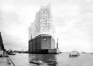 近了,越來(lái)越近了。我們乘坐的小船漸漸靠近碼頭。遠(yuǎn)遠(yuǎn)望去,紅褐色的外墻絲毫感受不到這座建筑的特殊,但手中新聞冊(cè)上的設(shè)計(jì)效果圖(見左圖)卻讓人陷入了無(wú)盡的遐想之中。 世人眼中,德國(guó)漢堡是一座港口城市。但如今,漢堡人要改變世人對(duì)它的印象。在易北河畔,漢堡人將建起一座宏偉的音樂廳——易北愛樂廳,它將躋身于世界十大音樂廳之列,給酷愛音樂的德國(guó)人再添一座如同柏林愛樂廳那樣的藝術(shù)殿堂。 “易北愛樂廳”