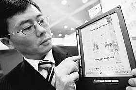 日前于北京舉行的第二屆中國數字出版博覽會上,工作人員在展示“電子紙”。范繼文