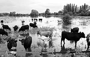 圖為7月23日在英國中部的牛津郡,牛群在洪水泛濫的草場(chǎng)吃草。新華社/法新 | 本報(bào)倫敦7月23日電