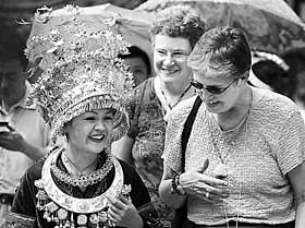 | 據(jù)貴州省旅游局統(tǒng)計,有“公園省”之稱的貴州省,今年上半年共吸引海內(nèi)外游客3224萬人次,6個月的旅游總收入達190.2億元,比上年同期增長55%,創(chuàng)下歷史新高。圖為一位苗族少女在貴州凱里市南花村同外國游客交流。新華社記者 楊俊江 攝 | 提前兌現(xiàn)WTO承諾