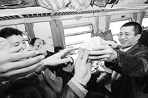 | 佟麗華在火車上給農(nóng)民工發(fā)放法律援助卡,受到歡迎。何俊昌