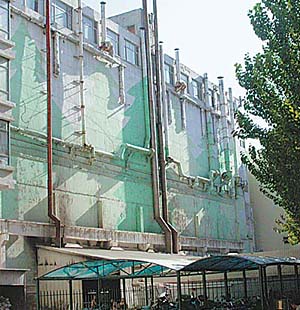 記者隨后來(lái)到麗都會(huì)館后面的中財(cái)雅典小區(qū)內(nèi)。只見(jiàn)一輛大車(chē)停在會(huì)館的鍋爐房門(mén)前,兩名裝卸工正在往車(chē)上裝爐渣。鍋爐房?jī)?nèi)的鍋爐正在運(yùn)轉(zhuǎn),沿墻而上的3根大煙囪直插夜空。