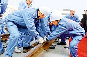 一般來說,23攝氏度是鋼軌鎖定的最佳溫度,可是工程恰好趕在了寒冬。“氣溫低對我們鋼軌鎖定技術(shù)提出了非常大的挑戰(zhàn),”中鐵二局股份公司副總經(jīng)理、京津城際項(xiàng)目部經(jīng)理王云波說,“我們?nèi)藶榘?500米的鋼軌拉伸了七八十厘米,再扣緊鎖定,由此保證了鋼軌一年四季的安全性。這在全世界都是絕無僅有的!