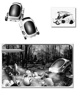 一輛汽車可以簡單分解成兩輛單人機車,外殼成了郊游的帳篷。 |