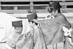 十四日,兩名東京明治神宮的神官為一名年滿二十歲的年輕人行“冠禮”。新華社記者 任正來