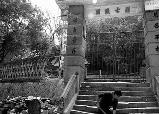浩氣長存”的對(duì)聯(lián)。有人正在清理堵在門前的沙石和木頭。鐵門少了一根鋼條,圍墻破了一個(gè)大窟窿,人可以輕易進(jìn)出(見圖①,余榮華攝)。 進(jìn)入陵園,“革命烈士永垂不朽”的紀(jì)念碑高高矗立,可碑前護(hù)欄卻破碎不堪,躺倒在地,周圍散落著碎石和枯葉(見圖②,余榮華攝)。附近居民說,經(jīng)常有些不懂事的孩子跑進(jìn)陵園玩耍,亂扔垃圾,甚至在墓碑旁玩火、放鞭炮。 葉必良的兒子葉金進(jìn)說,1988年陵園再次整修后,鎮(zhèn)、村會(huì)在清明節(jié)來祭掃,但陵園的日常打掃和維護(hù)主要是他們一家人負(fù)責(zé),陵園大門鑰匙也一直在他們手上,“但是也不可能天天來打掃”。 2005年底,“龍王”臺(tái)風(fēng)登陸福建,陵園地基和圍墻等遭到損壞,葉金進(jìn)曾向村、鎮(zhèn)、區(qū)三級(jí)遞交報(bào)告,希望能盡快對(duì)陵園進(jìn)行修繕。 “光靠我們家庭的力量,要修繕陵園很困難!彼f,“可事情一直拖著,門壞了,圍墻破了,如今連保證陵園的日常清潔都有些困難”。