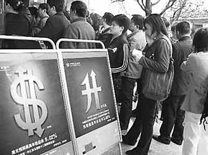 圖為北京一家銀行營業(yè)部,顧客在排隊購買外匯理財產(chǎn)品。 | 正在銷售的外匯理財產(chǎn)品