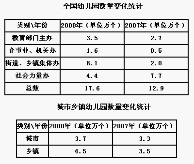 來自同一數(shù)據(jù)源的另一組數(shù)據(jù)表明,城市幼兒園的數(shù)量由2000年的3.7萬個,下降到2007年的3.3萬個,鄉(xiāng)鎮(zhèn)幼兒園從2000年的4.5萬個,下降到2007年的3.5萬個。無論是城市還是鄉(xiāng)鎮(zhèn),幼兒園的數(shù)量都在減少。
