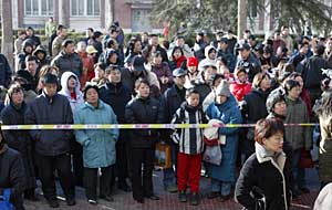 在北京某大學一考點外,許多家長在寒風中等待參加全國英語等級考試(PETS)的孩子。在此參加考試的考生絕大多數(shù)是中小學生。本報記者 羅偉