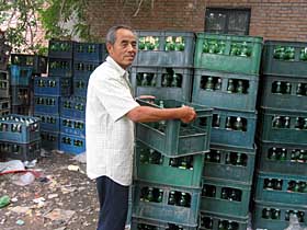 在天津市西青區(qū)的“世斌酒水批發(fā)部”,一位搬運瓶箱的老人站在華潤啤酒的瓶箱前,左后是豪門千杯啤酒的瓶箱。 |
