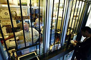 一名男子(右)在法國(guó)巴黎一家貨幣兌換處換錢。本報(bào)資料照片 | 美國(guó)將因金融監(jiān)管疏漏遭批