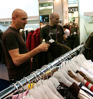 一位意大利采購商在一家紡織企業(yè)設在廣交會的展位前選購服裝。新華社記者
