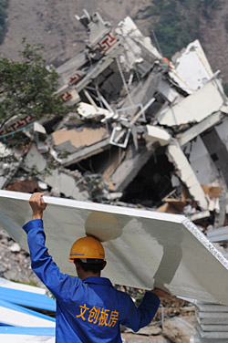 6月5日,工人們在汶川映秀鎮(zhèn)加緊建設(shè)活動(dòng)板房。新華社記者 武巍