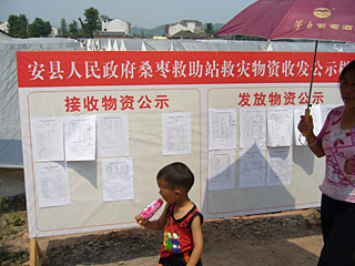 6月2日,都江堰市聚源鎮(zhèn)受災群眾集中安置點。 這里與教學樓整體垮塌的聚源中學只有一河之隔。附近鎮(zhèn)上所有房屋成了危房或已坍塌的居民都臨時搬到這里。隔河望去,一排排藏青色的民政救災帳篷整齊如軍營。 正值中午時分,帳篷里的人多外出辦事了,守在帳篷內(nèi)的多是婦女和老人。一對年輕夫婦正推著嬰兒車準備外出,一位上了歲數(shù)的大爺含一支煙袋,正外出遛鳥。帳篷中,人們的生活正以一種別樣的方式在繼續(xù)。 自阿壩州養(yǎng)路段退休的吳顯才與老伴袁桂華正在河邊的林蔭下休息,身旁還有孫子。他們都穿著企業(yè)捐贈的短袖衫,手中各喝著一瓶農(nóng)夫山泉礦泉水。吳顯才說:“我們家的房子在鎮(zhèn)上街邊,120平方米的房子全塌了。屋里的東西搶出來一些,電視也不知壞沒壞! 盡管戶口不在這里,他們還是領到了瓶裝水和快餐面。一些外地來的志愿者還給分發(fā)了常備物資,如感冒藥、藿香正氣水、衣服等。說著,他還指著自己穿的衣服說,上邊都標有太極藿香液的字樣。據(jù)說,這家企業(yè)向災區(qū)發(fā)放了10萬件衣服,見人就發(fā)。 聚源鎮(zhèn)8大隊1小隊的村民楊中芳說,他是本地戶口,救災物資只要來了,都有他們的份兒。家中發(fā)了夠10天吃的餅干,還有足夠喝的純凈水,20桶方便面。地震后的5天里,每天都會領到救災用的食品和水,后來隔幾天發(fā)一次。 在聚源鎮(zhèn)集中安置點,住在22號帳篷的李蓮剛泡了一包方便面,準備吃午飯。她對記者說,他們現(xiàn)在3家人住在一個帳篷里,現(xiàn)在有幾千人住在這個安置點。記者看到,帳篷內(nèi)有成堆的救災物資,有成箱的礦泉水、方便面、牛奶等。在靠近門口的一角,還堆著大米等成袋物資。李蓮說:“平時主要吃稀飯、餅干和方便面,也上街買菜,菜價與平時一個樣,只是魚價漲了! 6月5日,在綿陽市安縣睢水鎮(zhèn)幼兒園,正趕上鎮(zhèn)領導一班人在一個救災帳篷內(nèi)研究工作。他們正在傳達一份“特急”文件,要求救災物資的管理臺賬一定要建立起來,各鄉(xiāng)鎮(zhèn)每個部門、村民委員會都要建立公示救災物資發(fā)放制度,接受社會監(jiān)督。 對于救災物資登記發(fā)放工作,睢水鎮(zhèn)黨委書記馮德強說:“最開始,特別是震后前幾天,物資來源復雜。我們更多是做好災民的安置,讓受災群眾有東西吃,有地方住,有水和藥品。由于人手少,物資管理有些亂。” 馮德強說,但5月17日后,物資管理關口開始把嚴了,大宗物品均有村里簽字。救災物資都是現(xiàn)場統(tǒng)一配給,鄉(xiāng)鎮(zhèn)直接到發(fā)放點領取,各個村從鄉(xiāng)里領,小組再到村里領。其中,像帳篷、膠布、被子等容易清點的大宗物資把得很嚴,但像方便面等一些不好清點的物資,百姓不可能等著你清理好再領,所以具體數(shù)量上有些亂。 現(xiàn)在,全鎮(zhèn)6000來戶家庭,大概領到900多頂帳篷,都發(fā)放下去了,重點是解決山上受災最重的群眾。目前,帳篷缺口在1000頂左右。 6月5日,記者來到安縣桑棗救助站,這里臨時居住著2000多名受災群眾。來自安縣茶坪鄉(xiāng)的劉剛說,他們一個帳篷內(nèi)住了3家14個人,平時吃免費食堂,一般兩個素菜,偶爾還有肉吃,大米管夠。 民政部6月1日頒布了《汶川地震抗震救災生活類物資分配辦法》,規(guī)定物資發(fā)放點要吸收受災群眾推選的代表參與生活類物資的發(fā)放和管理工作,實行收發(fā)“實名制”。記者看到,在桑棗救助站內(nèi),已設有專門的接收發(fā)放救災物資公示欄,上面清楚地登記著有受災群眾簽字的領取物資明細。