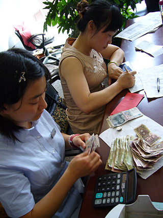 | 6月1日,四川省民政廳現(xiàn)金捐贈處。四川省工商銀行營業(yè)部城南支行工作人員李燕和楊爭在辦理著來自社會各界人士的捐款接收手續(xù)。 | 接收入賬,記好每一筆愛心捐款