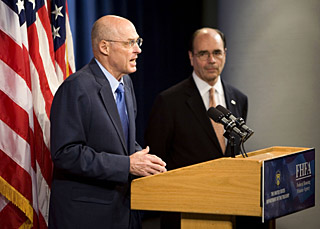 7日,美國財政部長亨利·保爾森在華盛頓舉行的記者招待會上講話。新華社/路透 | 美國聯(lián)邦政府7日宣布接管陷入困境的兩大住房抵押貸款融資機構(gòu)——房利美和房地美,以避免更大范圍金融危機的發(fā)生。這將成為美國有史以來規(guī)模最大的一次政府干預(yù)房地產(chǎn)市場行動。專家表示,美國政府此次救市本身也表明了形勢之嚴峻,而救市的實際效果還有待于時間檢驗。