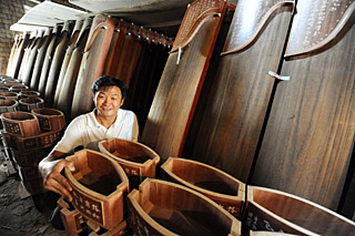 江西省樟樹市中洲鄉(xiāng)車塘村農(nóng)民付俊生正在檢驗古箏調(diào)音盒。2006年,他在上海打工學(xué)到技術(shù)后回家鄉(xiāng)辦起了古箏樂器作坊,年制作古箏上千架,銷往全國各地以及馬來西亞等國家和地區(qū)。新華社記者