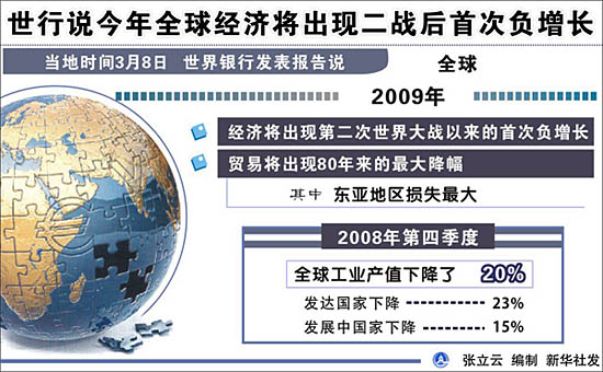 美國時間3月8日(北京時間3月9日),世界銀行發(fā)布報告稱,2009年全球經(jīng)濟將出現(xiàn)二戰(zhàn)后首次負(fù)增長,全球貿(mào)易將創(chuàng)出80年來的最大降幅,發(fā)展中國家也將面臨2700到7000億美元的融資缺口。為此,世行敦促20國集團向發(fā)展中國家提供幫助以滿足其外部融資需求。 周六(3月14日),20國集團財長和央行行長會議將在英國倫敦召開。在為此次會議準(zhǔn)備的一份名為《逆流而上:發(fā)展中國家如何應(yīng)對全球危機》的報告中,世界銀行作出了上述判斷。
