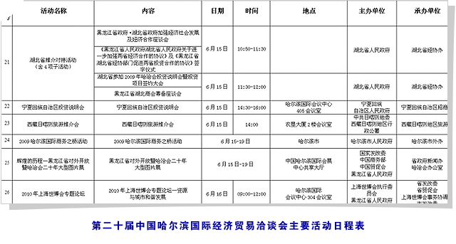 | 中國哈爾濱國際經(jīng)濟(jì)貿(mào)易洽談會(簡稱哈洽會)是國家批準(zhǔn)舉辦的大型對外交易會之一。自1990年創(chuàng)辦至今,已經(jīng)連續(xù)成功地舉辦了十九屆,有80多個國家和地區(qū)參會參展,累計(jì)參會參展的中外客商達(dá)150多萬人次,總成交額近千億美元。二十年來,哈洽會始終堅(jiān)持“突出俄羅斯、面向東北亞、輻射全世界、服務(wù)全中國”的辦會宗旨,不斷開拓創(chuàng)新,從初創(chuàng)走向成熟,從區(qū)域走向世界,已經(jīng)發(fā)展成為享譽(yù)國內(nèi)外的國家級、國際性經(jīng)貿(mào)盛會,哈洽會已經(jīng)成為中俄經(jīng)貿(mào)合作第一大展覽會。[詳細(xì)] | |