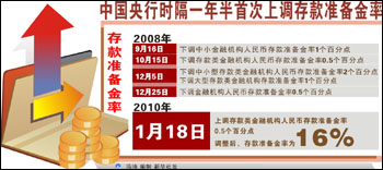 新年首周信貸的爆發(fā)式增長(zhǎng)讓央行提早出手。12日晚間,央行宣布,自1月18日起,上調(diào)存款準(zhǔn)備金率0.5個(gè)百分點(diǎn)。以2009年11月底59.27萬(wàn)億人民幣存款余額估算,同時(shí)考慮農(nóng)村信用社等小型金融機(jī)構(gòu)暫不上調(diào)因素,分析師預(yù)計(jì)這將回收2500億基礎(chǔ)貨幣。而且,由于央行上調(diào)時(shí)點(diǎn)早于預(yù)期,預(yù)計(jì)將對(duì)市場(chǎng)產(chǎn)生強(qiáng)烈緊縮預(yù)期。 同日,在例行的公開(kāi)市場(chǎng)操作中,央行還提高了一年期央票發(fā)行利率8.29個(gè)基點(diǎn)。當(dāng)日,發(fā)行了200億元一年期票據(jù),同時(shí)進(jìn)行了2000億元28天正回購(gòu)操作,共回籠資金2200億元。一年期票據(jù)發(fā)行價(jià)格為98.19元,參考收益率為1.8434%。該利率結(jié)束去年8月11日以來(lái)的持平局面,較原先的1.7605%上漲了8.29個(gè)基點(diǎn)。在此前的上周四,央行已經(jīng)提高了三個(gè)月期央票的發(fā)行利率4個(gè)基點(diǎn),同時(shí)提高了91天正回購(gòu)的利率3個(gè)基點(diǎn)。