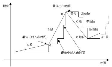 圖2-27A-B-C循環(huán)趨勢(shì)線 B趨勢(shì)線的橫坐標(biāo)記錄了B段經(jīng)歷的天數(shù),縱坐標(biāo)記錄了股價(jià)的變動(dòng),縱坐標(biāo)與橫坐標(biāo)之比記錄了股價(jià)上升的斜率。把經(jīng)歷B段天數(shù)的日成交量累加可計(jì)算出換手率和總成交量。通過(guò)軟件的特別功能,可計(jì)算出持股人數(shù)變化比。 C趨勢(shì)線的橫坐標(biāo)記錄了C段經(jīng)歷的天數(shù),縱坐標(biāo)記錄了股價(jià)的變動(dòng),縱坐標(biāo)與橫坐標(biāo)之比記錄了股價(jià)下降的斜率。把經(jīng)歷C段天數(shù)的日成交量累加可計(jì)算出換手率和總成交量。通過(guò)軟件可計(jì)算出持股人數(shù)變化比。 從入市風(fēng)險(xiǎn)來(lái)研究,A趨勢(shì)線的入市風(fēng)險(xiǎn)最小,B趨勢(shì)線次之,C趨勢(shì)線風(fēng)險(xiǎn)最大。 “風(fēng)險(xiǎn)入市法”規(guī)定,C趨勢(shì)線和B趨勢(shì)線的高價(jià)臺(tái)階是高風(fēng)險(xiǎn)時(shí)間段和高風(fēng)險(xiǎn)臺(tái)階,也是中長(zhǎng)線投資者禁止入市的時(shí)間段和臺(tái)階。 A-B-C循環(huán)趨勢(shì)線能提供給投資者最佳的入市時(shí)間。入市的最佳時(shí)間是B趨勢(shì)線的起始點(diǎn)的前后幾個(gè)交易日;A-B-C循環(huán)趨勢(shì)線給出了最佳出市時(shí)間,出市的最佳時(shí)間是C趨勢(shì)線起始點(diǎn)前后幾個(gè)交易日。 如圖2-28所示,A-B-C循環(huán)趨勢(shì)線加上每一段的臺(tái)階式走勢(shì)可以告訴您當(dāng)前股票在哪一段或哪一個(gè)臺(tái)階上運(yùn)行的精確位置,并借助計(jì)算機(jī)的幫助,可以知道未來(lái)股市的準(zhǔn)確走勢(shì)。 這種兩級(jí)劃分方法使股價(jià)走勢(shì)圖形更加清晰、清楚。絕大部分投資者所關(guān)心的是股市當(dāng)天和未來(lái)的走勢(shì)。所以,對(duì)當(dāng)前和未來(lái)的走勢(shì)要細(xì)分,而對(duì)過(guò)去的走勢(shì)可粗分。 圖2-28清楚地告訴投資者當(dāng)前股票處在走勢(shì)中的準(zhǔn)確位置,準(zhǔn)確地告訴投資者最佳入市段、入市階、最佳出市段和出市階。 圖2-28A-B-C循環(huán)趨勢(shì)線和各段臺(tái)階式走勢(shì)示意圖 A-B-C循環(huán)趨勢(shì)線為計(jì)算機(jī)提供準(zhǔn)確的數(shù)據(jù)取樣點(diǎn)和時(shí)間周期。通過(guò)對(duì)這個(gè)時(shí)間周期所定義的大量數(shù)據(jù)進(jìn)行分析、整理、比較和計(jì)算,可以準(zhǔn)確地了解到莊家和跟莊者的持股數(shù)量、操盤(pán)手法和A、B、C各段所發(fā)生的準(zhǔn)確時(shí)間以及持續(xù)的長(zhǎng)度,從而得到準(zhǔn)確的入市時(shí)間和出市時(shí)間。