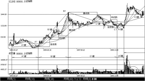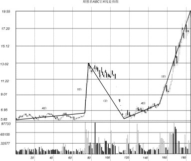 (二)上證指數(shù)三段三階的實(shí)戰(zhàn)劃分 圖2-34是上海股票市場(chǎng)大盤(pán)上證指數(shù)(1995年3月至2000年4月)的周K線和成交量走勢(shì)圖。 在圖2-34中: ●C0至A1組成A段。A段是莊家和跟莊者秘密收集籌碼階段,股指在低位盤(pán)整,成交量比前期放大但仍呈萎縮狀況,持續(xù)時(shí)間一年。 ●A1至B1組成B段。成交量比前期放大,經(jīng)常出現(xiàn)天量,股價(jià)呈低、中、高三臺(tái)階式上升,這是莊家和跟莊者大量吸進(jìn)籌碼,拉高股價(jià)階段。持續(xù)時(shí)間1年零3個(gè)月。 ●B1至C1組成C段。這是莊家和跟莊者派貨階段,成交量比B段萎縮,股價(jià)呈高、中、低三臺(tái)階式下降,持續(xù)時(shí)間2年。 ●C0至C1組成第一個(gè)A-B-C三階循環(huán)趨勢(shì)線,持續(xù)時(shí)間約4年。 ●C1至A2組成第二個(gè)A段,持續(xù)時(shí)間4個(gè)月后,另一個(gè)三階循環(huán)趨勢(shì)線開(kāi)始。 圖2-34上證指數(shù)三段三階的劃分 ●在A-B-C三循環(huán)趨勢(shì)線的劃分中,A段起始點(diǎn)的確定有一定難度。在后面的章節(jié)作進(jìn)一步介紹。 ●圖2-34是上證指數(shù)大盤(pán)的走勢(shì)。大盤(pán)的走勢(shì)代表了大部分上海個(gè)股的走勢(shì),是個(gè)股走勢(shì)的集合。這充分說(shuō)明A-B-C三循環(huán)趨勢(shì)線分析方法的正確性,是股票走勢(shì)的共性。 ●股價(jià)是疊加在A-B-C三階循環(huán)趨勢(shì)線的隨機(jī)過(guò)程。 九、深滬二地個(gè)股三段三階劃分的案例 (一)深圳股票深寶安(0009) 圖2-35是深圳股票深寶安(0009)1995年7月至2000年5月的周K線和成交量走勢(shì)圖。 在圖2-35中: ●A至B組成B段。成交量比前期放大,經(jīng)常出現(xiàn)天量,股價(jià)呈低、中、高三臺(tái)階式上升,這是莊家和跟莊者大量吸進(jìn)籌碼,投機(jī)拉高股價(jià)階段。B段持續(xù)時(shí)間約一年。 圖2-35深圳股票深寶安三段三階的劃分 ●B1至C1組成C段。這是莊家和跟莊者派貨階段,成交量比B段極度萎縮,股價(jià)呈高、中、低三臺(tái)階式下降,C段持續(xù)時(shí)間約兩年6個(gè)月。 ●C至A1組成第二個(gè)A段。成交量從萎縮到開(kāi)始放大,持續(xù)時(shí)間7個(gè)月后,另一輪三循環(huán)趨勢(shì)線開(kāi)始。 (二)上海股票上海石化(600689) 圖2-36是上海股票上海石化(600689)1995年7月至2000年5月的周K線和成交量走勢(shì)圖。 在圖2-36中: ●A至B組成B段。成交量比前期放大,經(jīng)常出現(xiàn)天量,股價(jià)呈低、中、高三臺(tái)階式上升,這是莊家和跟莊者大量吸進(jìn)籌碼,拉高股價(jià)階段。B段持續(xù)時(shí)間約兩年。 ●B1至C1組成C段,是莊家和跟莊者的派貨階段,成交量極度萎縮,股價(jià)呈高、中、低三臺(tái)階式下降。C段持續(xù)時(shí)間約二年。 ●C至A1組成第二個(gè)A段。成交量從萎縮到開(kāi)始放大。A段的持續(xù)時(shí)間約10個(gè)月。另一輪三循環(huán)趨勢(shì)線又開(kāi)始。 圖2-36上海股票上海石化三段三階的劃分 十、理想的A-B-C三段循環(huán)走勢(shì) (一)模擬理想的A-B-C三段循環(huán)走勢(shì) 圖2-37是理想的A-B-C三階循環(huán)走勢(shì)圖。這個(gè)走勢(shì)圖是從實(shí)際出發(fā),根據(jù)多張走勢(shì)圖形總結(jié)出的一個(gè)理想的A-B-C三段循環(huán)走勢(shì)圖形。這個(gè)走勢(shì)圖形也是股市操盤(pán)手追求的走勢(shì),能用最少的成本給莊家和跟莊者帶來(lái)最大的利潤(rùn)。 圖2-37模擬理想的A-B-C三段循環(huán)走勢(shì)圖 A段走勢(shì)是一個(gè)低價(jià)位的箱形震蕩走勢(shì),股價(jià)波動(dòng)在15%左右,每日成交均量和換手率在1%左右。這樣的股價(jià)變動(dòng)和成交量不影響股價(jià)的向上攀升。100個(gè)交易日換手率在100%。通過(guò)換手,莊家和跟莊者收購(gòu)了大量的籌碼。從圖中成交量顯示,莊家和跟莊者控制了45%以上的流通籌碼。 B段走勢(shì)是一條幾乎垂直的上升斜線。四個(gè)交易日,股價(jià)上漲了(13.02–6.5)/6.5×100%=100%,達(dá)到階段性天量,B段 結(jié)束,C段開(kāi)始。 上圖的C段走勢(shì),頭28個(gè)交易日是一個(gè)高位直角三角形震蕩走勢(shì)。三角形的直邊是股價(jià)的最大變動(dòng)值,該值在高位11.22元~13.02元約16%之間波動(dòng)。每日的成交均量和換手率在4%左右,相當(dāng)于莊家和跟莊者每日向市場(chǎng)派4%(其中部分是散戶的籌碼)左右的籌碼。很顯然,這是莊家和跟莊者最理想的派貨走勢(shì)。高價(jià)派貨股價(jià)不降,28個(gè)交易日總成交量和換手率達(dá)110%以上,說(shuō)明莊家和跟莊者在低位買(mǎi)進(jìn)的籌碼在高位已基本派完。 第29個(gè)交易日,莊家和跟莊者用所;I碼把股價(jià)打壓,連續(xù)7個(gè)交易日股價(jià)呈無(wú)量下跌(低位無(wú)人接貨)走勢(shì)。股價(jià)從13.02元降到5.85元。跌幅(5.85–13.02)/13.02×100%=–55%,絕對(duì)值7.17元。股價(jià)打回原形達(dá)到地價(jià),C段結(jié)束,A段 走勢(shì)開(kāi)始,又開(kāi)始了新一輪三段三階走勢(shì)。 圖2-37顯示了理想的三階循環(huán)走勢(shì)。在實(shí)戰(zhàn)中,A段和B段的圖形走勢(shì)是容易做到的。特別是當(dāng)莊家和跟莊者收購(gòu)了流通股的80%后就可以做出任何拉升走勢(shì)。有時(shí)可在一個(gè)交易日內(nèi)把股價(jià)拉升200%。但在高位如何把手中所控的籌碼賣(mài)出,