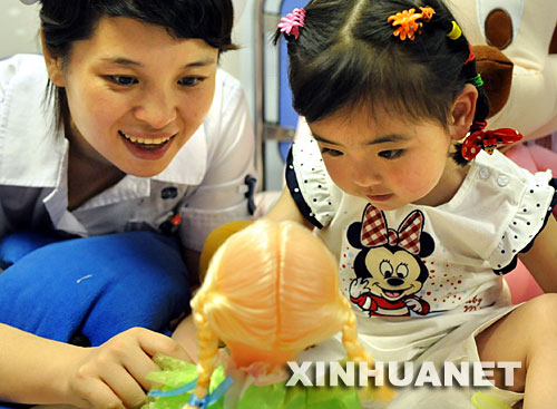 6月1日,病床上的宋馨懿在護士的陪伴下玩娃娃。