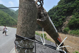 5月31日,一位村民從被洪水沖毀的電力、通訊設(shè)施旁走過(guò)。