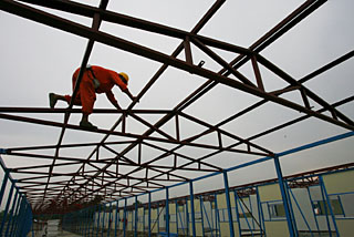 6月4日,一名工人在四川省什邡市洛水鎮(zhèn)搭建活動板房。新華社發(fā)(鐘敏