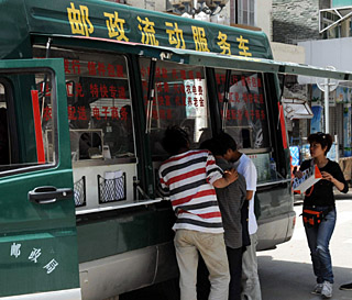 汶川街頭出現(xiàn)郵政流動服務(wù)車。6月9日,人們在街頭的郵政流動服務(wù)車辦理郵政業(yè)務(wù)。新華社記者 唐召明