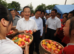 6月20日至22日,中共中央政治局常委、國務(wù)院總理溫家寶到受汶川大地震波及的陜西、甘肅災(zāi)區(qū)檢查指導(dǎo)抗震救災(zāi)工作,看望干部群眾。這是6月21日,溫家寶在甘肅隴南市康縣平洛鎮(zhèn)貫溝村大莊社視察時,村民送來新摘的油桃。
