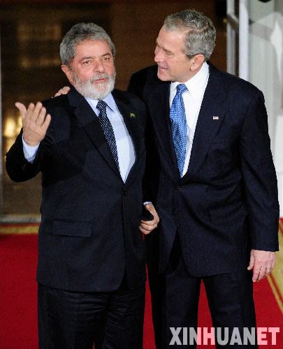 11月14日,美國(guó)總統(tǒng)布什(右)在白宮迎接前來出席二十國(guó)集團(tuán)領(lǐng)導(dǎo)人金融市場(chǎng)和世界經(jīng)濟(jì)峰會(huì)的巴西總統(tǒng)盧拉。二十國(guó)集團(tuán)領(lǐng)導(dǎo)人金融市場(chǎng)和世界經(jīng)濟(jì)峰會(huì)將于11月15日在華盛頓舉行。除二十國(guó)集團(tuán)成員領(lǐng)導(dǎo)人外,聯(lián)合國(guó)、世界銀行、國(guó)際貨幣基金組織、金融穩(wěn)定論壇等國(guó)際機(jī)構(gòu)負(fù)責(zé)人也將出席峰會(huì)。