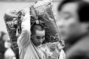 11月23日,一名返鄉(xiāng)的農(nóng)民工肩扛行李走出安徽阜陽(yáng)火車站。安徽省要求各地建立農(nóng)民工返鄉(xiāng)旬報(bào)制度。新華社發(fā) |