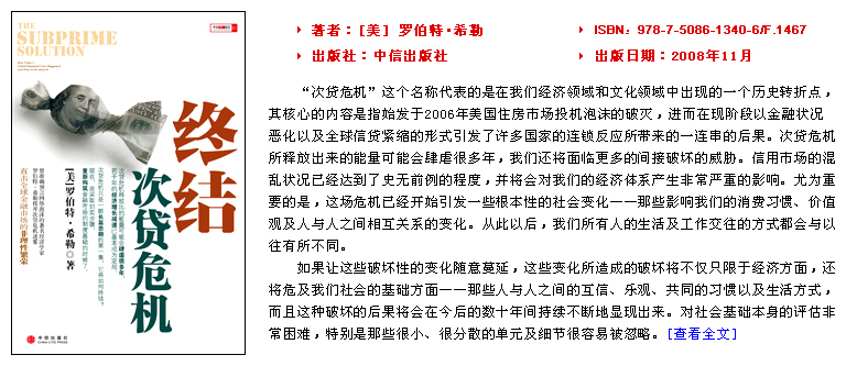 希勒的新書對(duì)這次次貸危機(jī)進(jìn)行了深入的分析,為政策制定者、華爾街和全球投資者提供了深入而細(xì)致的參考。 |